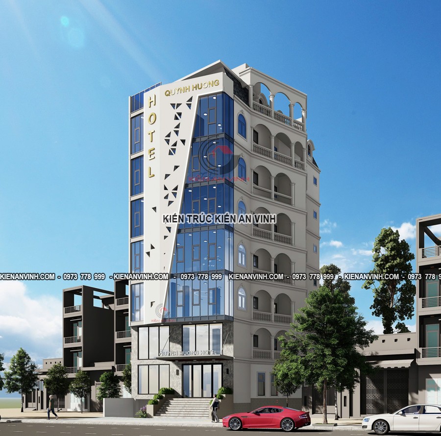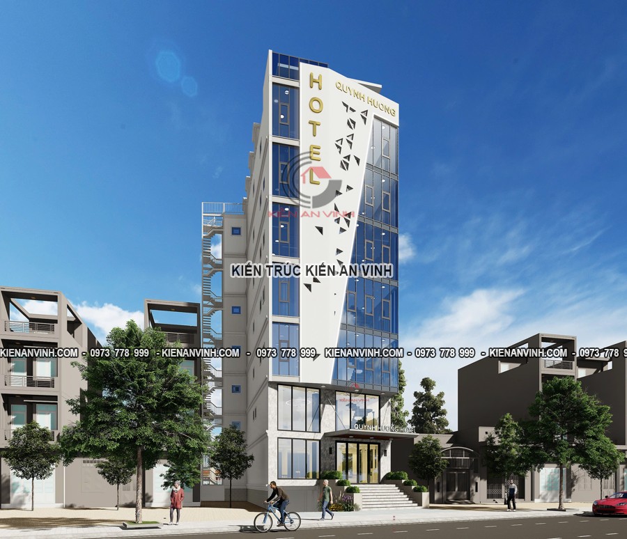 Một trong những yếu tố then chốt của dự án chính là hình khối gọn gàng, đường nét dứt khoát đem lại cảm giác hiện đại, sang trọng và chuyên nghiệp. Điều này giúp khách sạn tránh được sự rườm rà, lạc hậu thường thấy ở các công trình cũ, đồng thời tạo ra điểm nhấn rõ ràng, dễ nhận diện thương hiệu cho khách sạn.