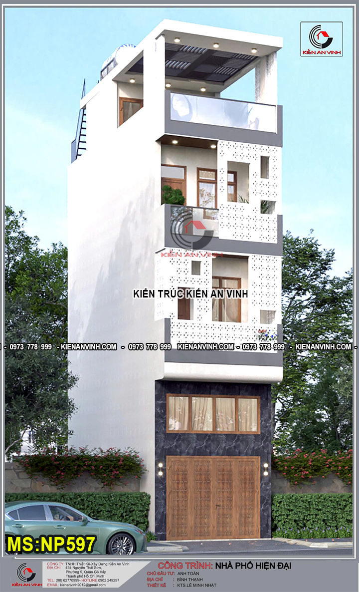 Mẫu nhà ống hiện đại này không chỉ thể hiện một cách trọn vẹn xu hướng thiết kế nhà ống đô thị mà còn là biểu tượng tiện nghi với nhiều tính năng hiện đại, từ thang máy tích hợp, gara ô tô trong nhà, mặt tiền khối vuông vức cho đến các ban công kính kết hợp cây xanh, tạo thành một không gian sống lý tưởng cho gia đình hiện đại.