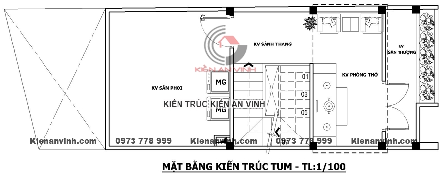 Việc áp dụng các giải pháp chiếu sáng, ban công xanh cũng như tầng tum mở đa năng giúp ngôi nhà trở nên linh hoạt, tiện ích và khá hiện đại, không bị giới hạn bởi diện tích đất.