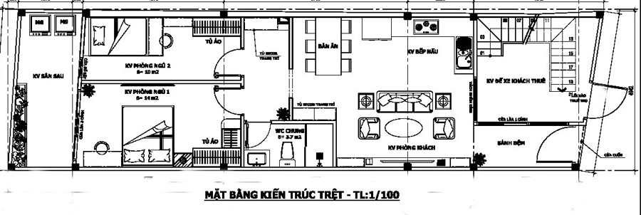 Tầng trệt của ngôi nhà được tận dụng tối đa để đảm bảo công năng sử dụng hiệu quả. Tầng trệt được chừa khoảng 3m phía trước làm khu vực để xe máy trong nhà, thuận tiện và đảm bảo an toàn. Vị trí này vừa giúp bảo vệ phương tiện khỏi thời tiết và trộm cắp vừa thuận tiện cho việc ra vào.