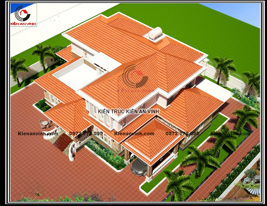 Kích thước biệt thự 24x20m cho phép bố trí không gian nội thất rộng rãi, thoáng đãng, cùng với mái Nhật giúp bảo vệ công trình khỏi tác động thời tiết, hoàn thiện tính bền vững lâu dài. Mái cũng góp phần tạo nên hiệu ứng thị giác không gian kiến trúc cao ráo, sang trọng.