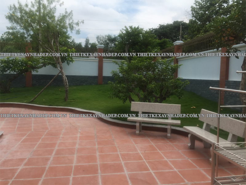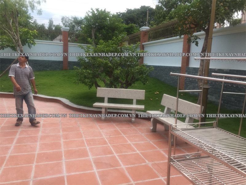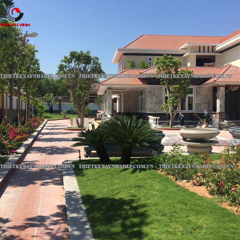 Dưới tán cây xanh và trên sân gạch đỏ, khu vực sân vườn rộng thoáng trở thành một không gian nghỉ ngơi lý tưởng. Gia chủ có thể tổ chức các buổi tiệc ngoài trời, cho trẻ chơi đùa, hoặc đơn giản là tận hưởng không khí trong lành.