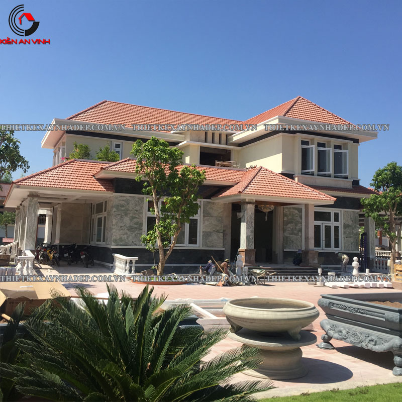 Một trong những yếu tố quan trọng tạo nên sự bề thế và sang trọng của biệt thự chính là hệ cột trụ chịu lực mạnh mẽ cùng với Thi công biệt thự vườn 2 tầng mái nhật đỏ nổi bật: Hệ mái nhiều tầng lớp, xếp chồng tinh tế.