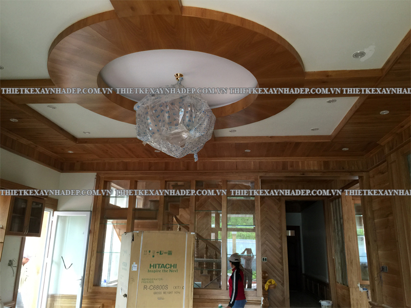 Trần nhà được ốp gỗ toàn bộ, phối hợp hệ thống đèn âm trần