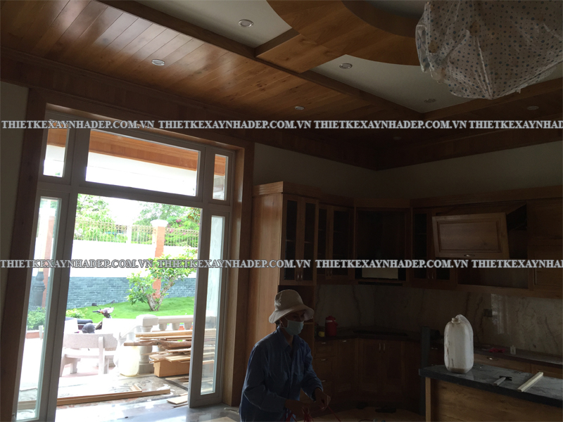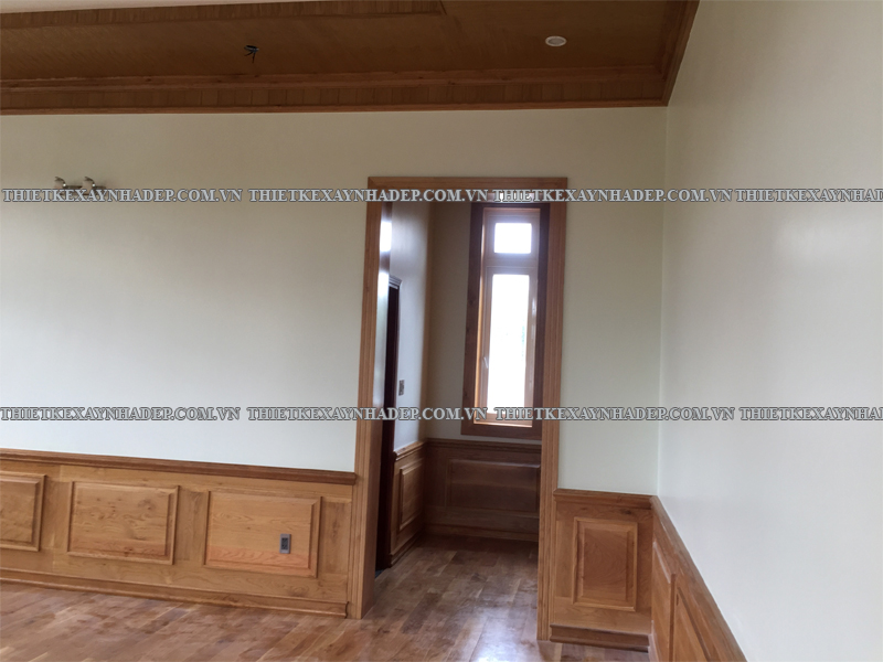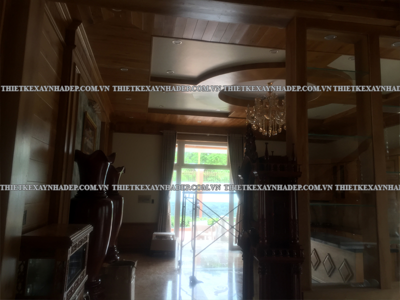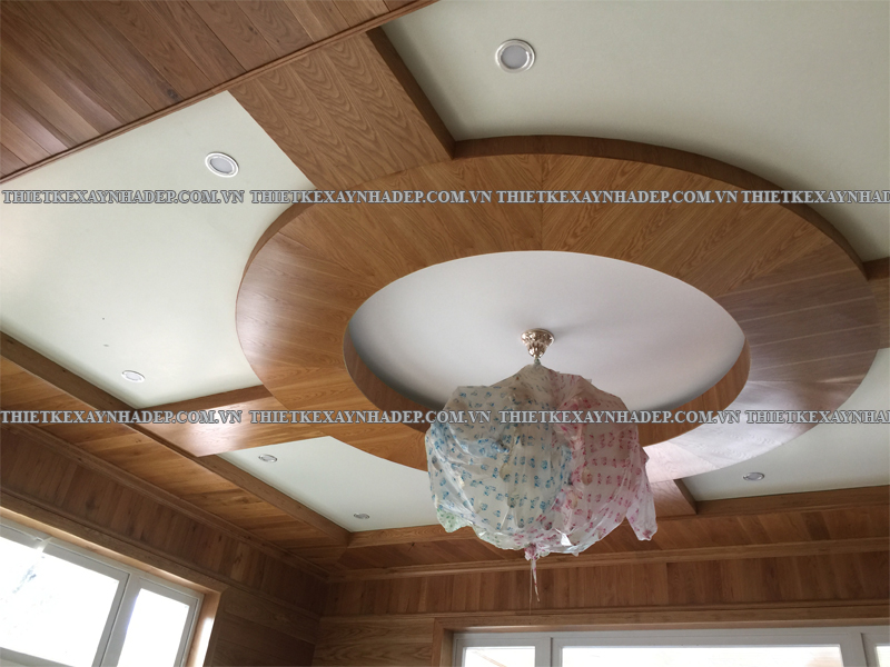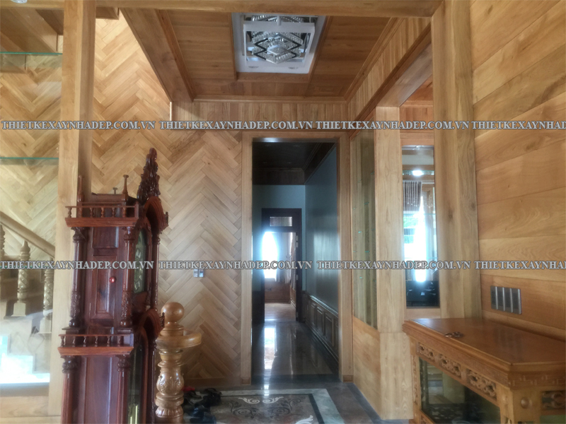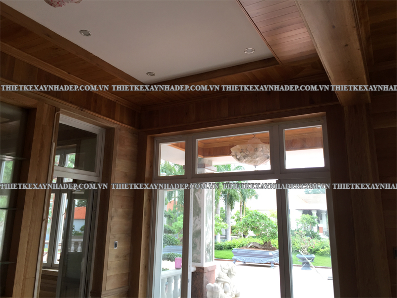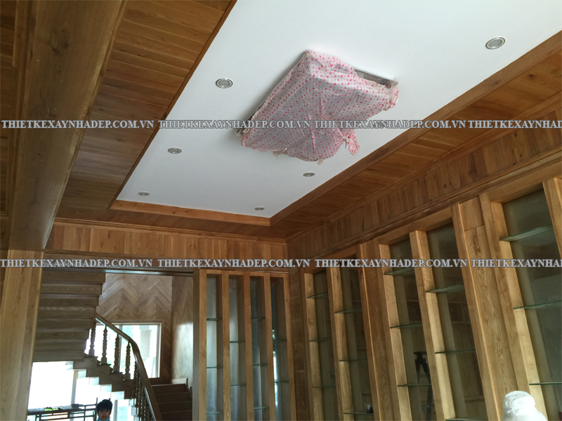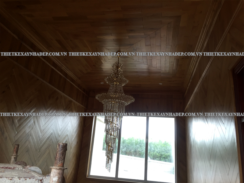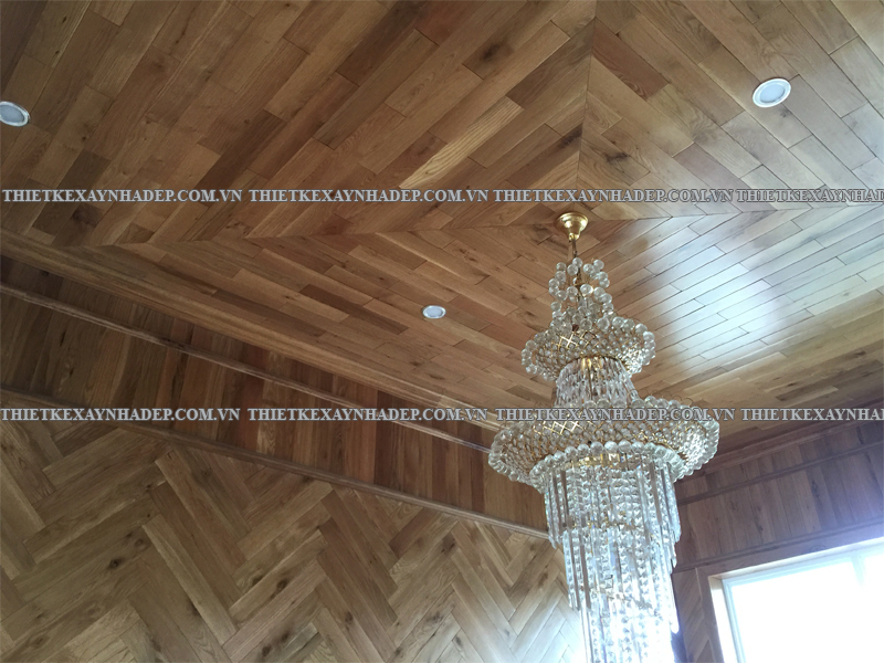 Một điểm nhấn đặc biệt của nội thất biệt thự là trần nhà được ốp gỗ hoàn toàn kết hợp hệ thống đèn âm trần hiện đại. Thiết kế này tạo ra hiệu ứng ánh sáng lan tỏa dịu nhẹ, nâng cao vẻ đẹp sang trọng và tạo chiều sâu cho không gian.