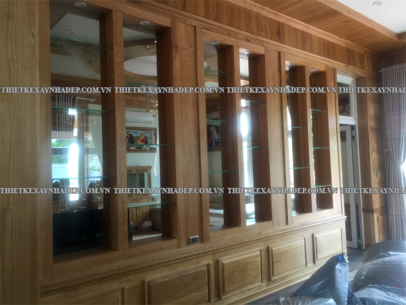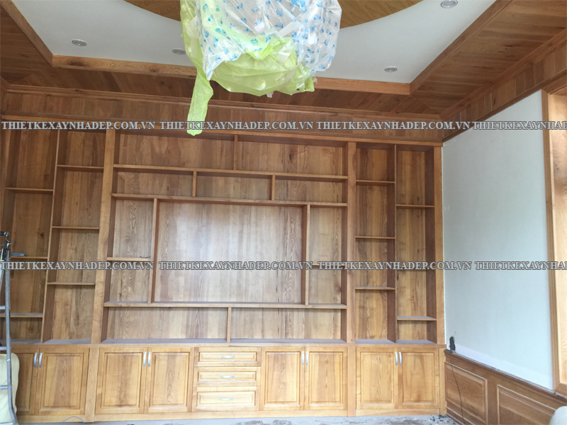 Phòng khách – Tường và vách ốp gỗ kết hợp kệ tủ âm tường