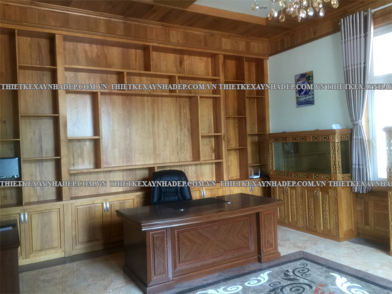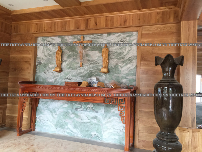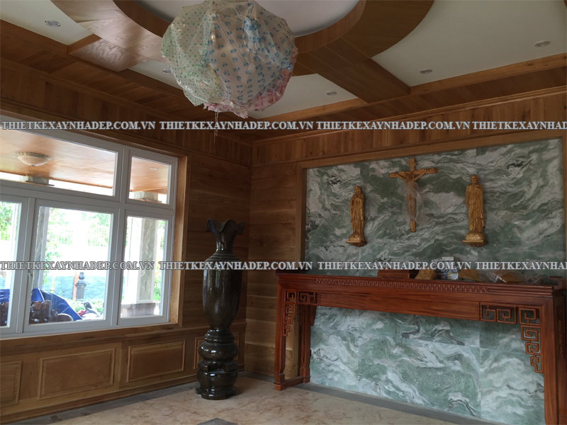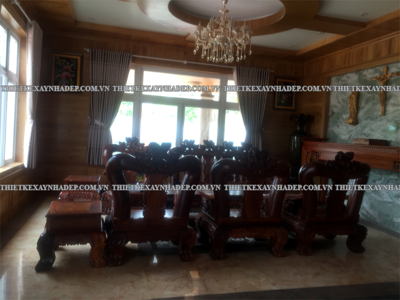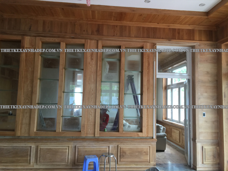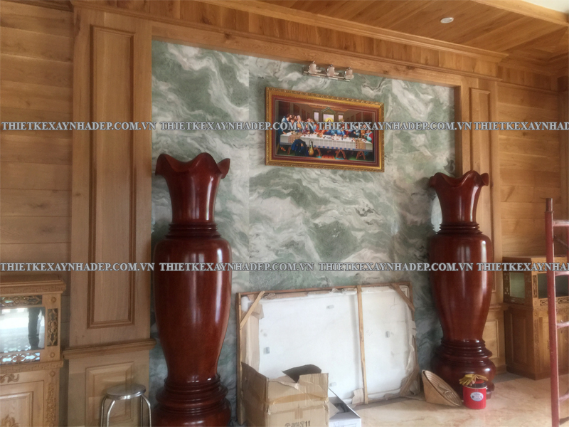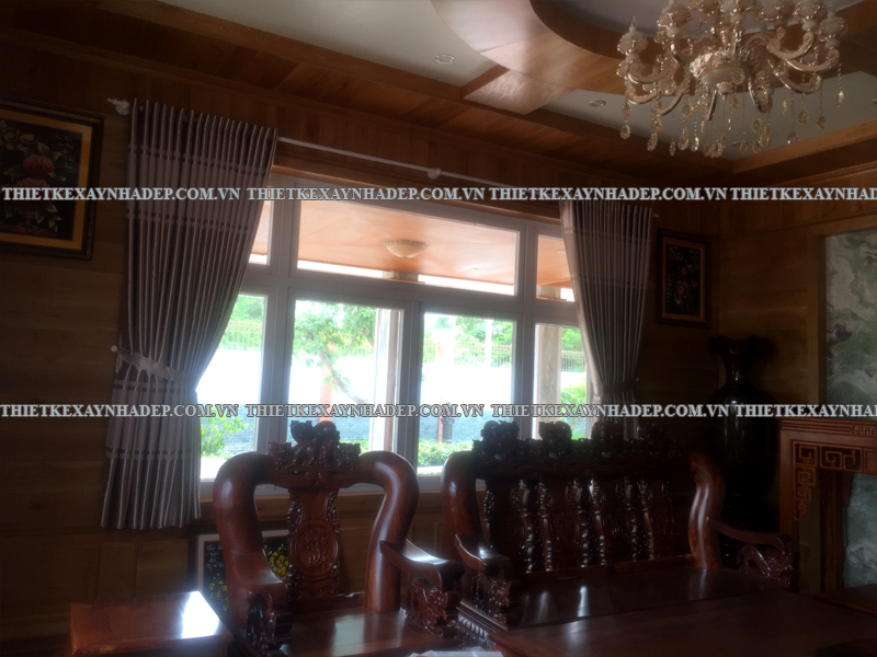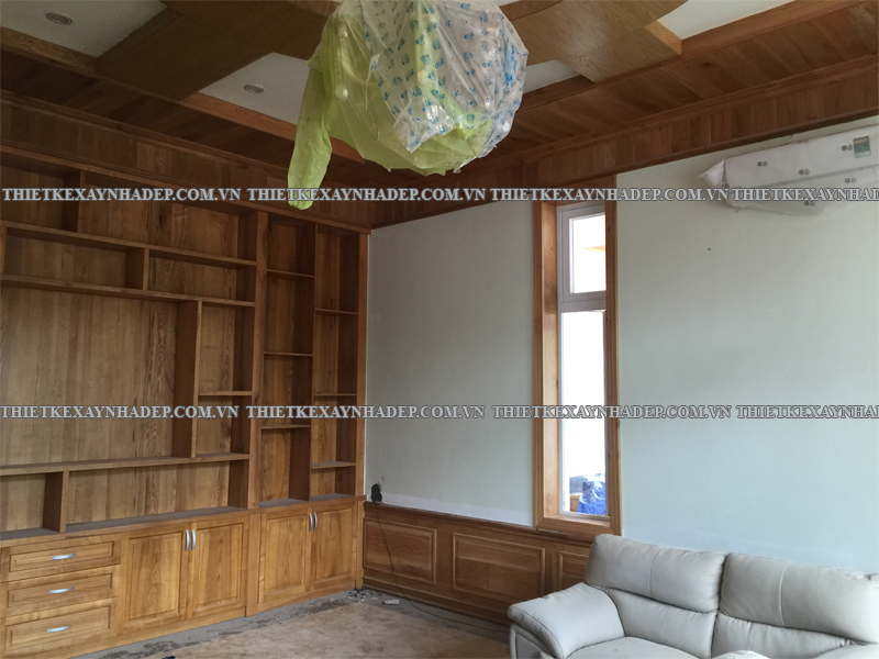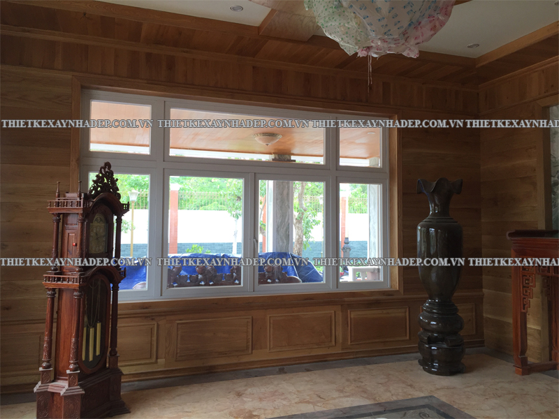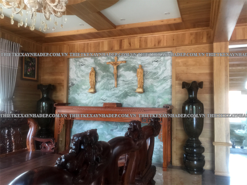 Các mảng gỗ trang trí chạy dọc tường được thiết kế công phu, kết hợp hài hòa cùng đồ nội thất lớn như sofa, bình gốm, tủ gỗ giúp tạo phong cách nội thất vừa cổ điển vừa hiện đại. Đây là nét đặc trưng trong thi công biệt thự vườn 2 tầng mái nhật giữ được sự ấm cúng, không lạnh lẽo.