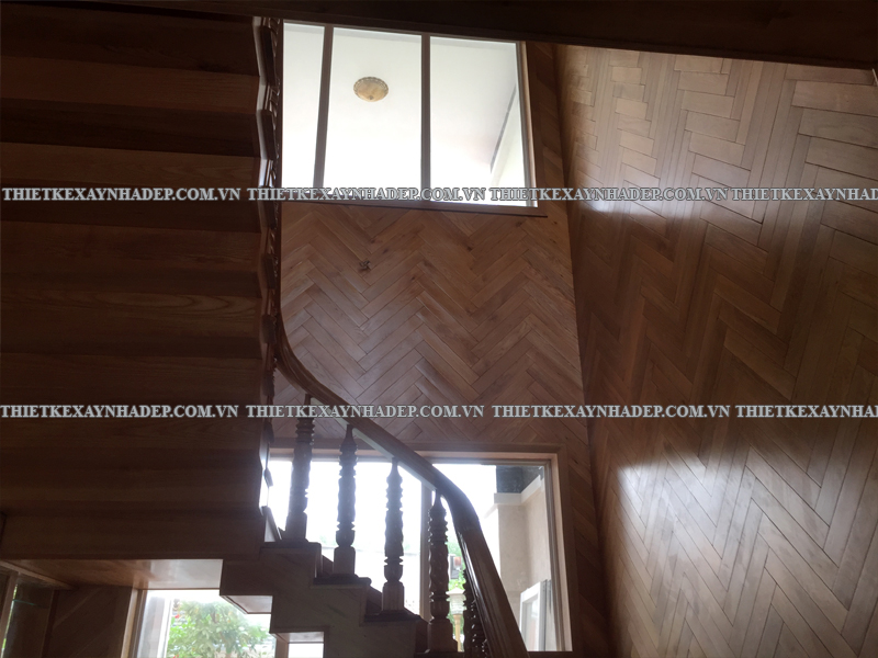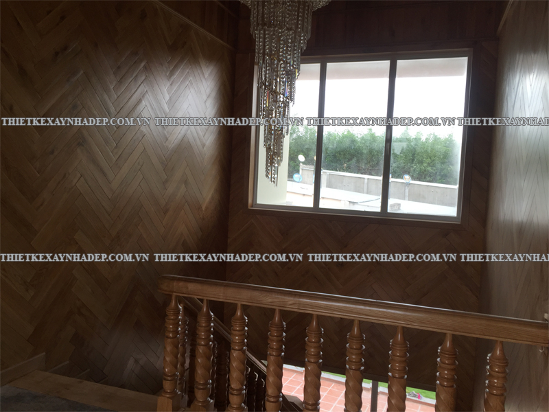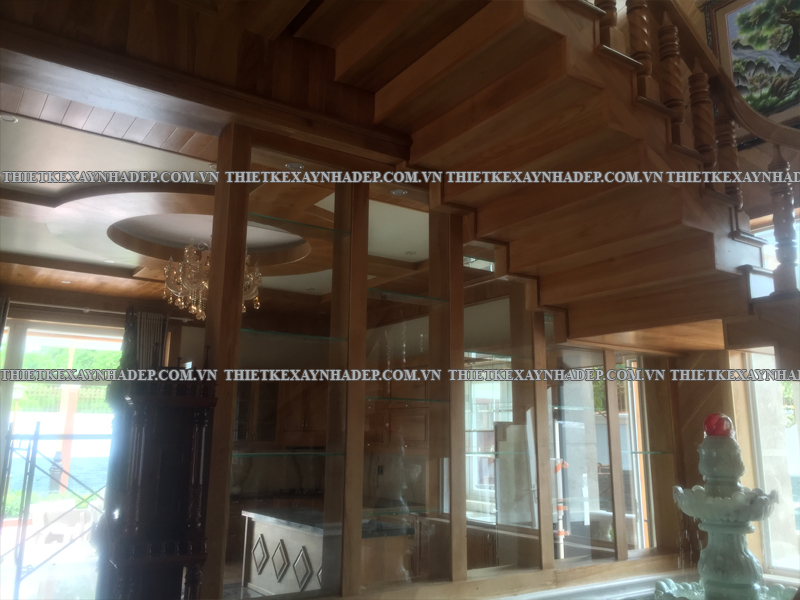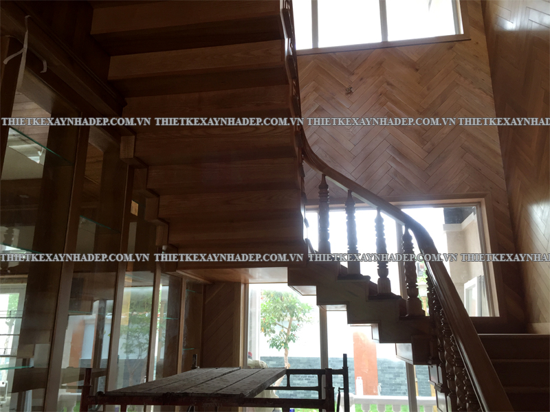 Cầu thang gỗ tinh tế mang lại cảm giác mộc mạc, sáng thoáng mà vẫn sang trọng, góp phần hoàn thiện không gian nội thất biệt thự.