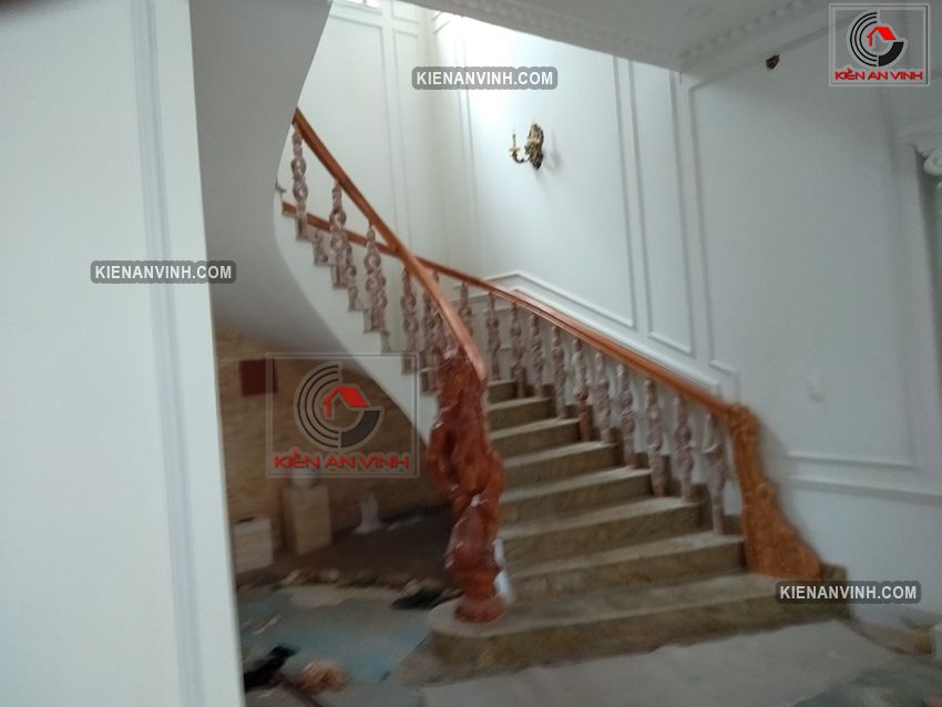 Đặc điểm nổi bật trong thi công biệt thự mái thái 2 tầng 3 mặt tiền tân cổ điển pha hiện đại là việc sử dụng hai cột tròn cao nối dài từ tầng 1 lên tầng 2 kết hợp với ban công nhôm mạ vàng hình "bụng bầu". Các chi tiết này vừa mang tính trang trí vừa góp phần tăng tính bền vững của công trình về mặt kết cấu.