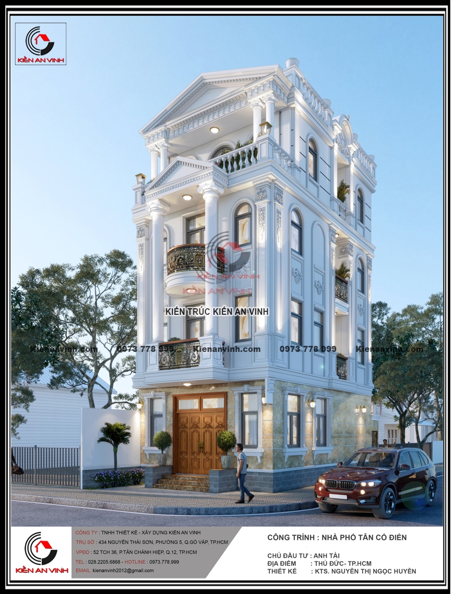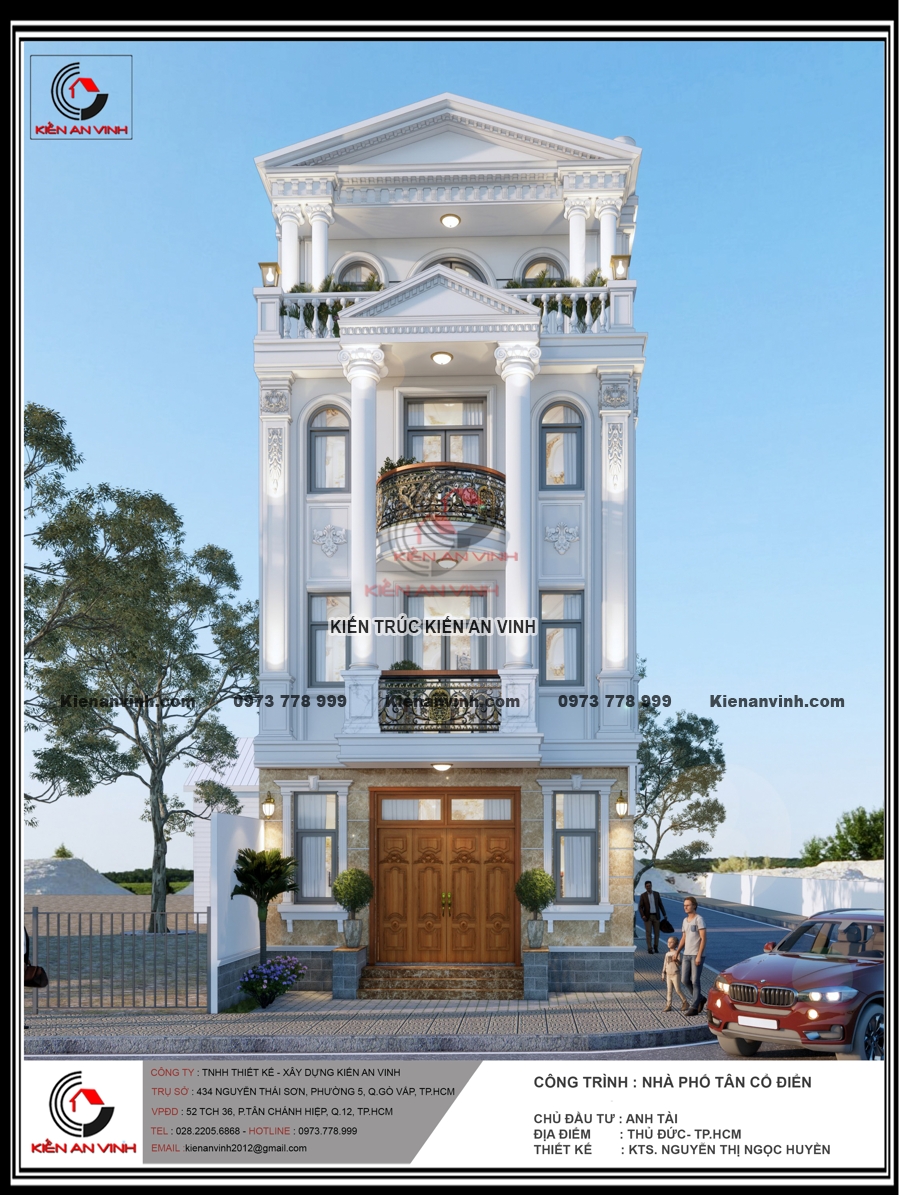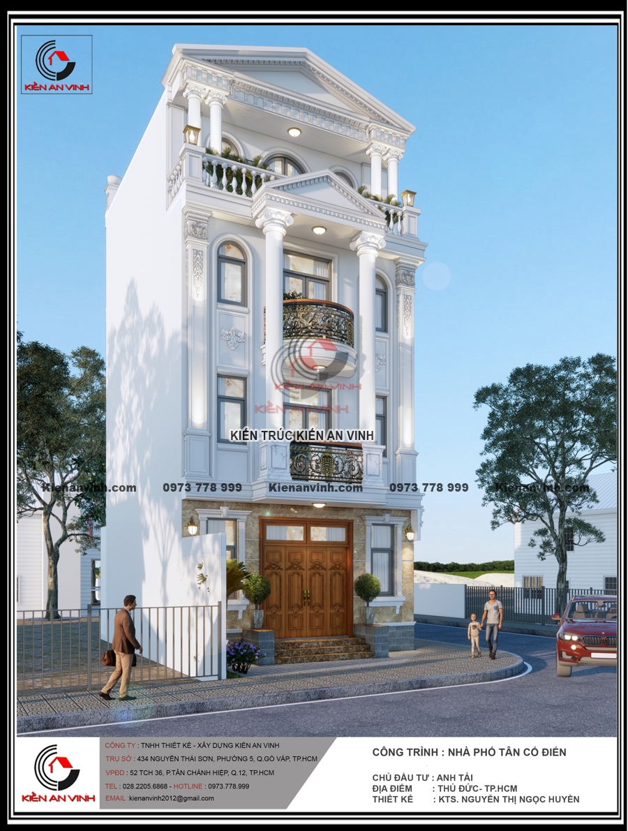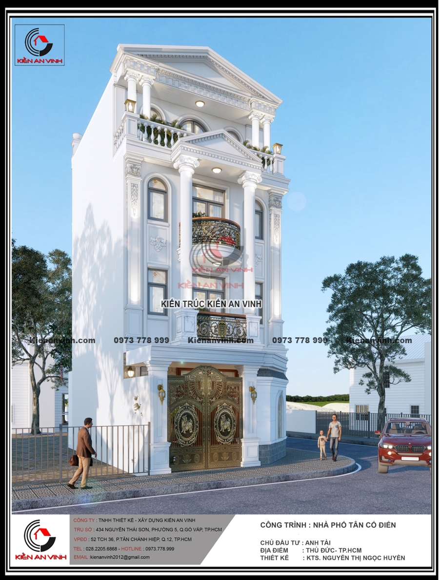 Không chỉ đẹp về kiến trúc với hệ cột tròn, phào chỉ và ban công uốn cong mềm mại, mặt tiền nổi bật gam màu trắng tinh tế cùng đá ốp sang trọng, mà còn đảm bảo công năng, thẩm mỹ và độ bền đáng kinh ngạc. Công trình nhà phố tân cổ điển 4 tầng này thực sự là minh chứng cho sự kết hợp hoàn hảo giữa nghệ thuật kiến trúc và kỹ thuật xây dựng bền vững, mang lại không gian sống đẳng cấp giữa lòng đô thị hiện đại.