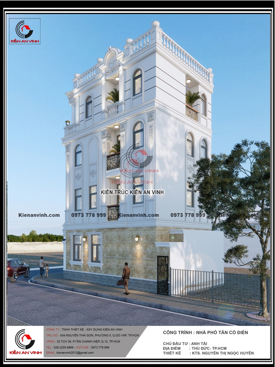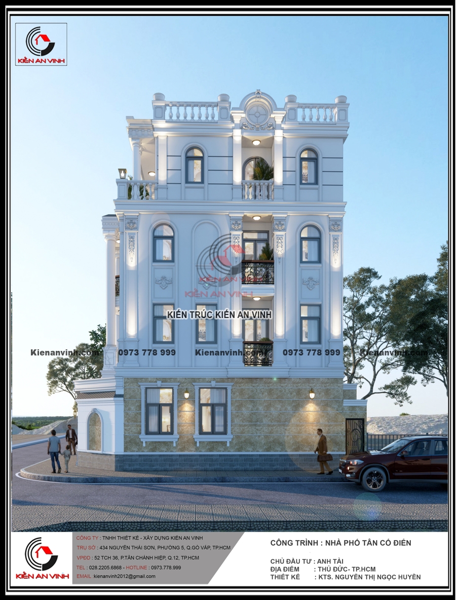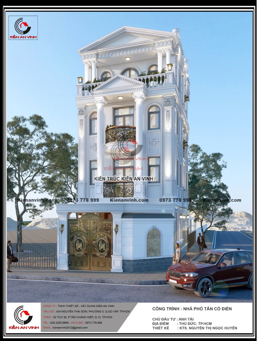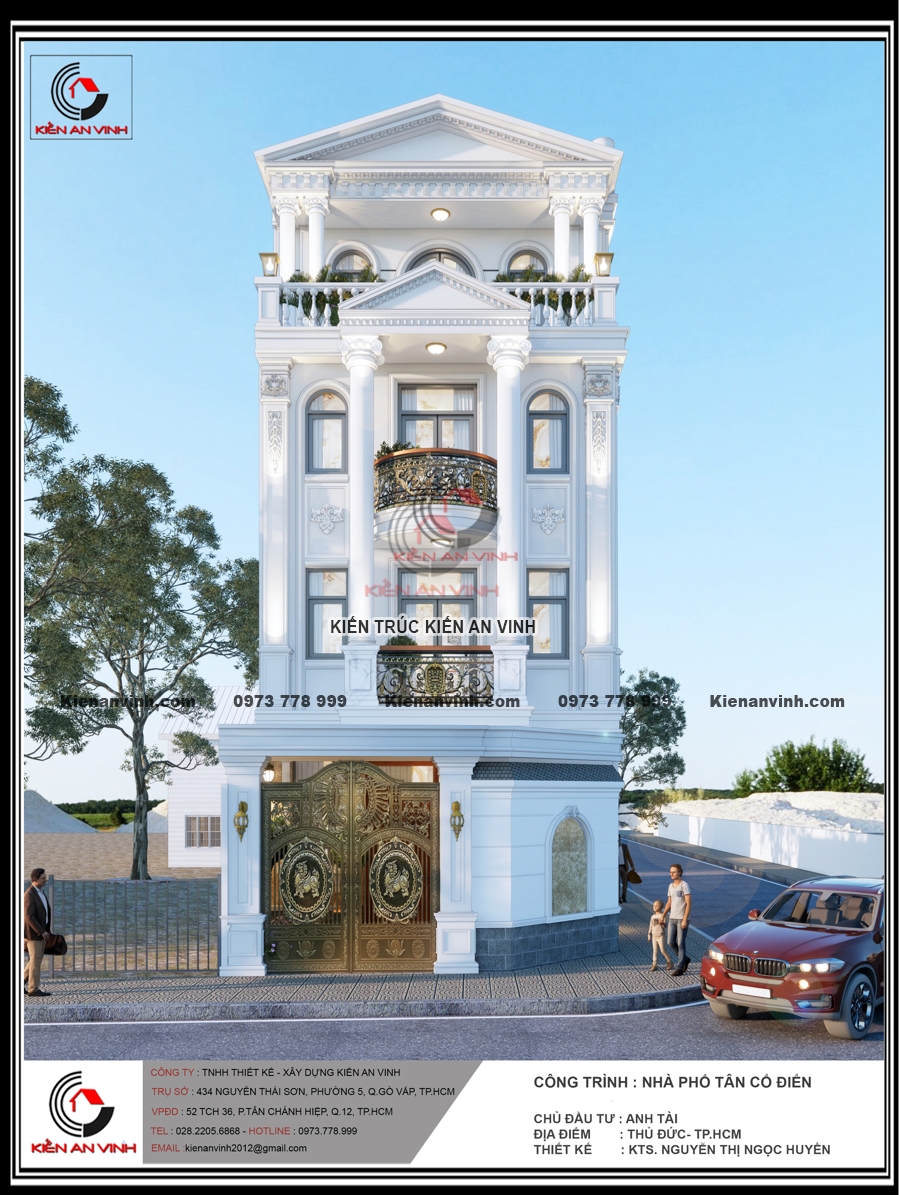Không chỉ đẹp về kiến trúc với hệ cột tròn, phào chỉ và ban công uốn cong mềm mại, mặt tiền nổi bật gam màu trắng tinh tế cùng đá ốp sang trọng, mà còn đảm bảo công năng, thẩm mỹ và độ bền đáng kinh ngạc. Công trình nhà phố tân cổ điển 4 tầng này thực sự là minh chứng cho sự kết hợp hoàn hảo giữa nghệ thuật kiến trúc và kỹ thuật xây dựng bền vững, mang lại không gian sống đẳng cấp giữa lòng đô thị hiện đại.