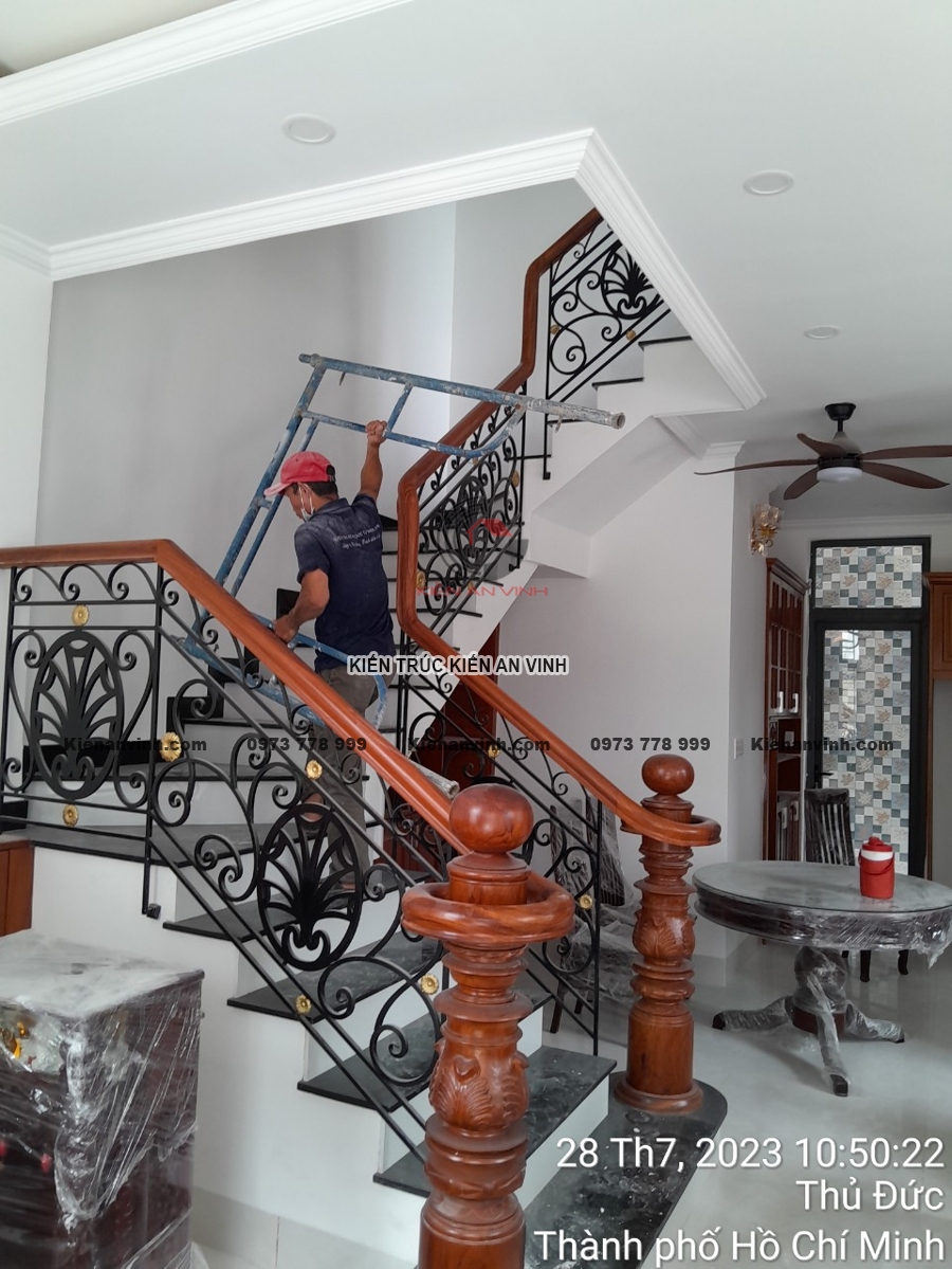 Một yếu tố không thể bỏ qua trong thi công nhà phố tân cổ điển 4 tầng chính là hệ cửa và lan can sắt mỹ thuật được gia công tỉ mỉ. Những đường nét hoa văn trên cửa sắt và lan can không chỉ đáp ứng yêu cầu an toàn, độ bền mà còn mang tính thẩm mỹ cực kỳ cao.