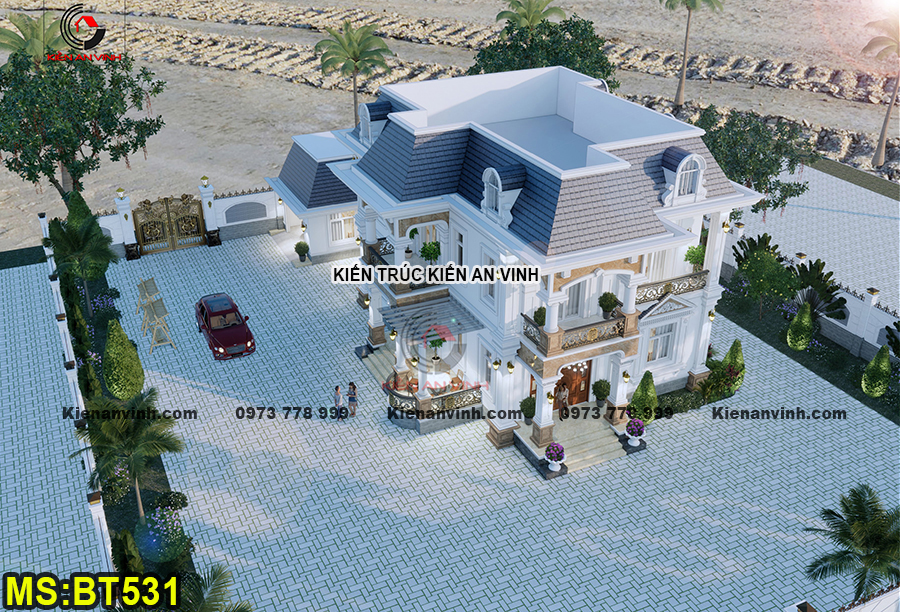 Phần mái được thi công phức tạp bằng cách xây gạch kết hợp đổ bê tông dốc, tạo khoảng không gian tầng áp mái rộng rãi và chống nóng hiệu quả. Mái Mansard không chỉ mang tính thẩm mỹ nổi bật với các độ dốc đặc trưng mà còn giúp mở rộng diện tích sử dụng gia tăng công năng biệt thự.