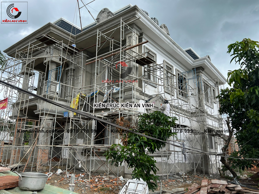 Hệ thống giàn giáo nêm và lưới bao che được lắp đặt dày đặc xung quanh công trình để phục vụ việc thi công mái và đắp phào chỉ ở tầng cao. An toàn lao động được đặt lên hàng đầu nhằm bảo vệ sức khỏe và tính mạng của người lao động cũng như đảm bảo tiến độ công trình không bị gián đoạn do các sự cố tai nạn.