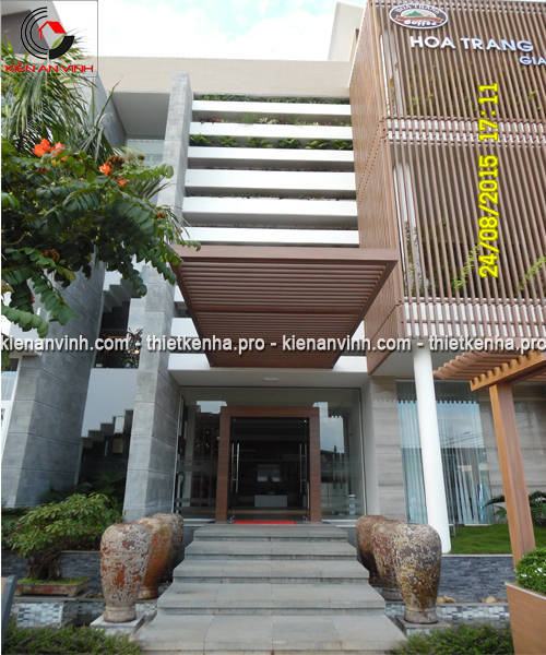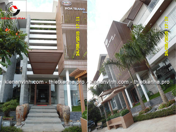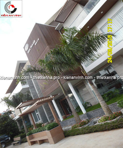 Hoàn thiện mặt tiền: Ốp đá granite, lắp dựng hệ lam gỗ nhựa và thi công mái che