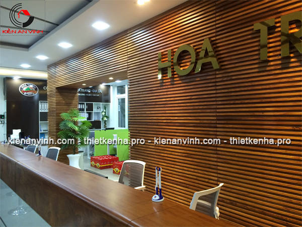 Quầy lễ tân ốp gỗ chạy ngang toàn bộ chiều dài tường tạo sự đồng bộ chắc chắn và hiệu quả thẩm mỹ cao.