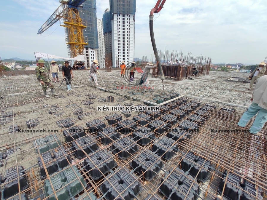 Đổ bê tông được tiến hành thành hai lớp: lớp đầu tiên làm nhiệm vụ cố định hộp trong khi lớp thứ hai được đổ toàn phần và đầm kỹ để tránh hiện tượng hộp bị nổi hoặc dịch chuyển. Bảo dưỡng bê tông thi công phải được thực hiện nghiêm ngặt, giữ ẩm liên tục để đảm bảo độ bền, hạn chế rạn nứt do co ngót bê tông. Cuối cùng là tháo cốp pha đúng thời điểm để đảm bảo sàn đạt đủ sức chịu tải trước khi đưa vào sử dụng.